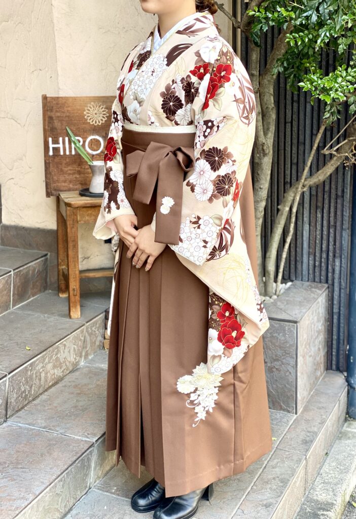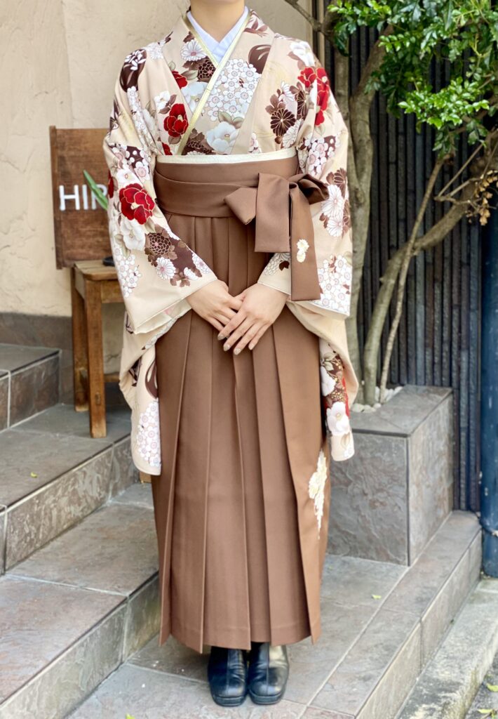| 大学生 袴着付け | 3月は卒業シーズンですね☆ お洋服でベージュカラーの組み合わせで、 レンタル着物は着物の丈の長さが短いので、着付けもしやすく簡単です☆ 4月より新たなスタートですね♪